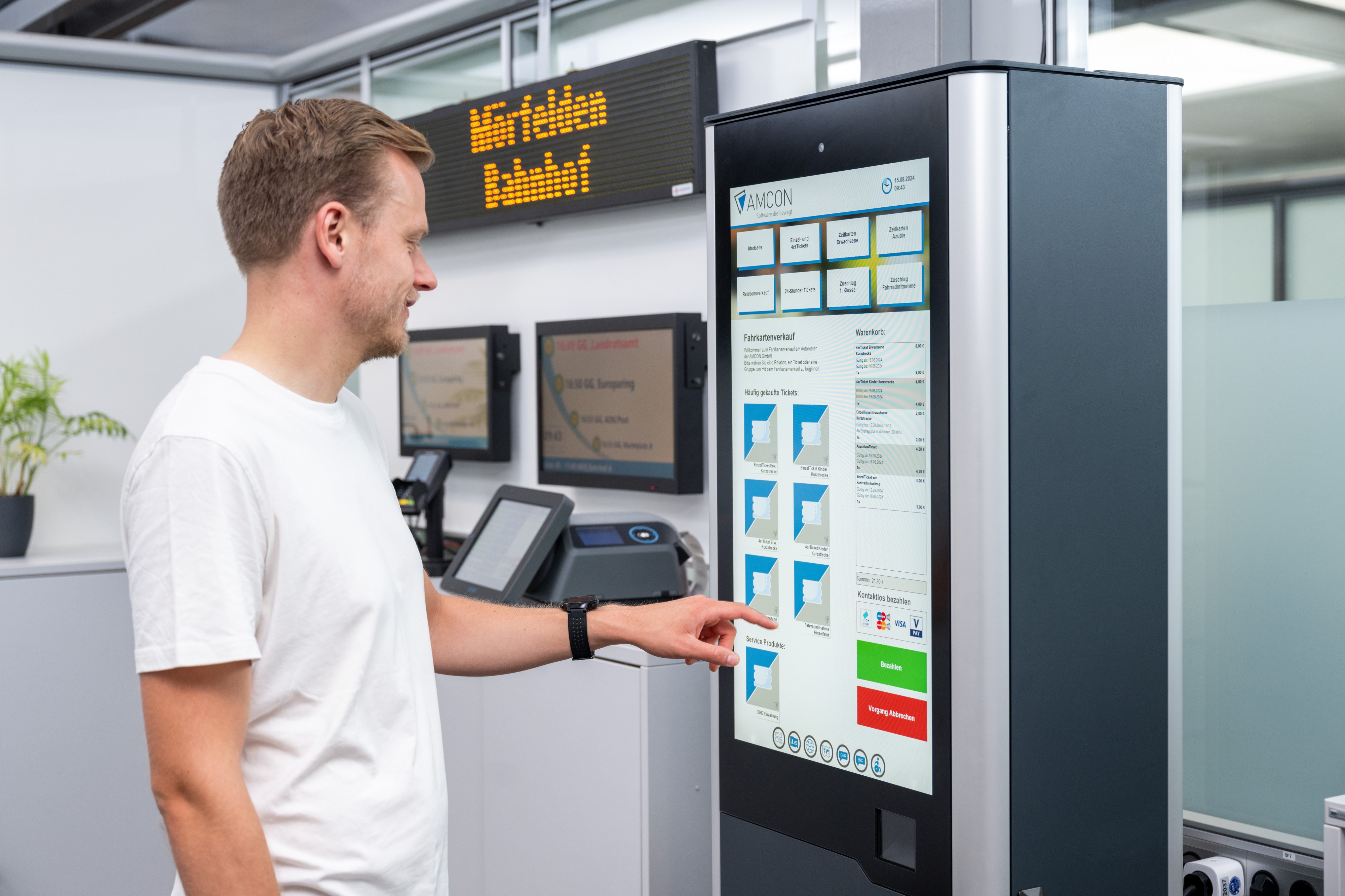 Ob Fahrscheinautomaten, Vorverkaufskassen, Kontrollgeräte, Webshops, Apps oder Bordrechner in Bussen – unsere Lösungen decken nahezu alle Abläufe rund um Ticketing und Information im ÖPNV ab.