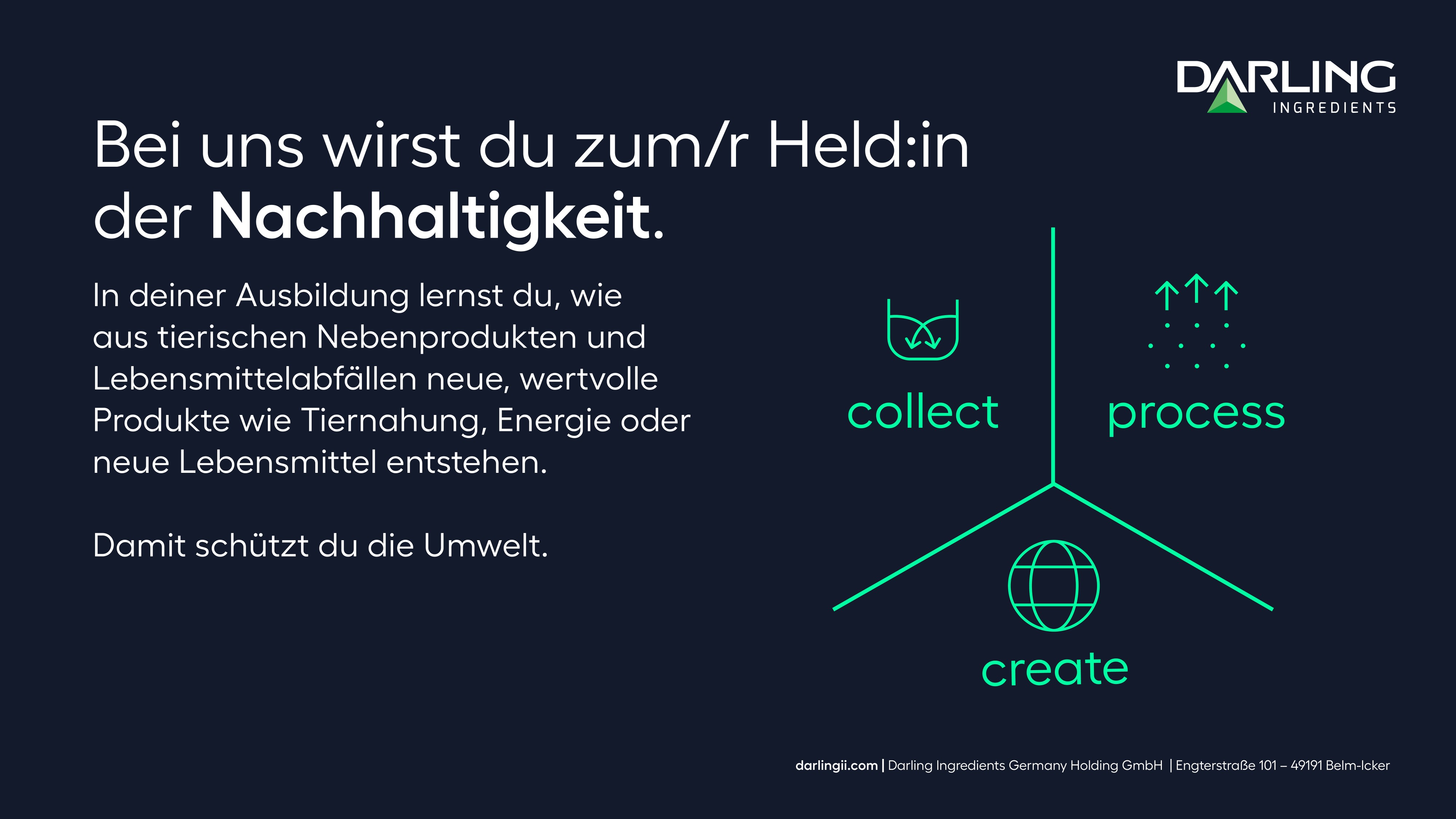 Darling Ingredients ist weltweit das größte börsennotierte Unternehmen, das organische Nebenprodukte und Lebensmittelabfälle in nachhaltige Produkte umwandelt. Wir verwerten etwa 15 % der weltweiten Abfallströme der Fleischindustrie zu Produkten mit Mehrwert, wie z. B. grüner Energie, erneuerbarem Diesel, Kollagen, Düngemittel, tierische Proteine, Lebensmitteln und Zutaten für Tiernahrung. Darling hat seinen Hauptsitz in Irving, Texas, USA und ist weltweit an mehr als 260 Standorten und mit über 16.000 Mitarbeitenden vertreten. In Deutschland legen sich an 11 Standorten über 750 motivierte Köpfe gemeinsam für unsere Ziele ins Zeug. Zeit, dass Du uns auf unserem Weg in die Zukunft begleitest.