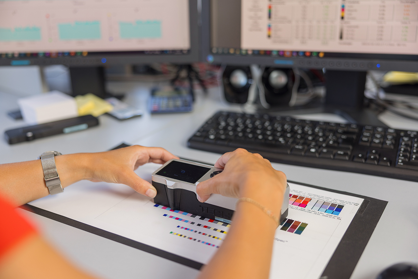 Um eine gleichbleibende Druckqualität zu gewährleisten, prüft und misst der Medientechnologe Druck die bedruckten Bogen aus, kontrolliert die Passgenauigkeit der Druckbilder, regelt die Farbdosierung und richtet die Maschinen ein.