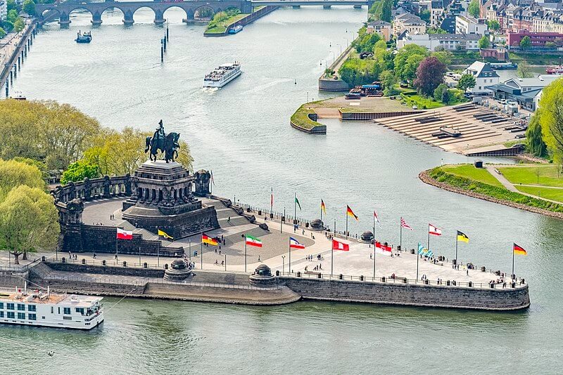 Hier fließen der Rhein und die Mosel ineinander. Dieser Ort ist weltbekannt als Deutsches Eck und gehört seit 2002 zum UNESCO-Welterbe. Neben der örtlichen Seilbahn kann man von hier aus den Schiffen zusehen und hat einen einzigartigen Ausblick auf die vom Wasser durchzogene Innenstadt.