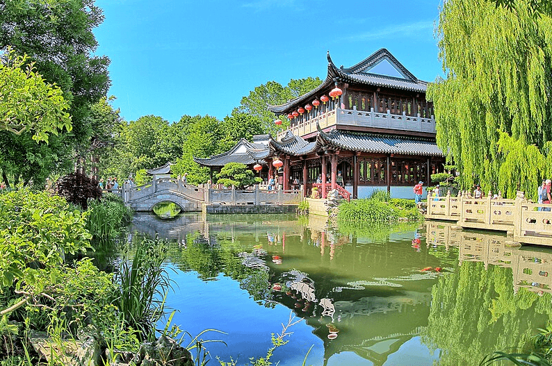 Aussicht auf den Luisenpark mit japanischen Spitzdach-Häuschen